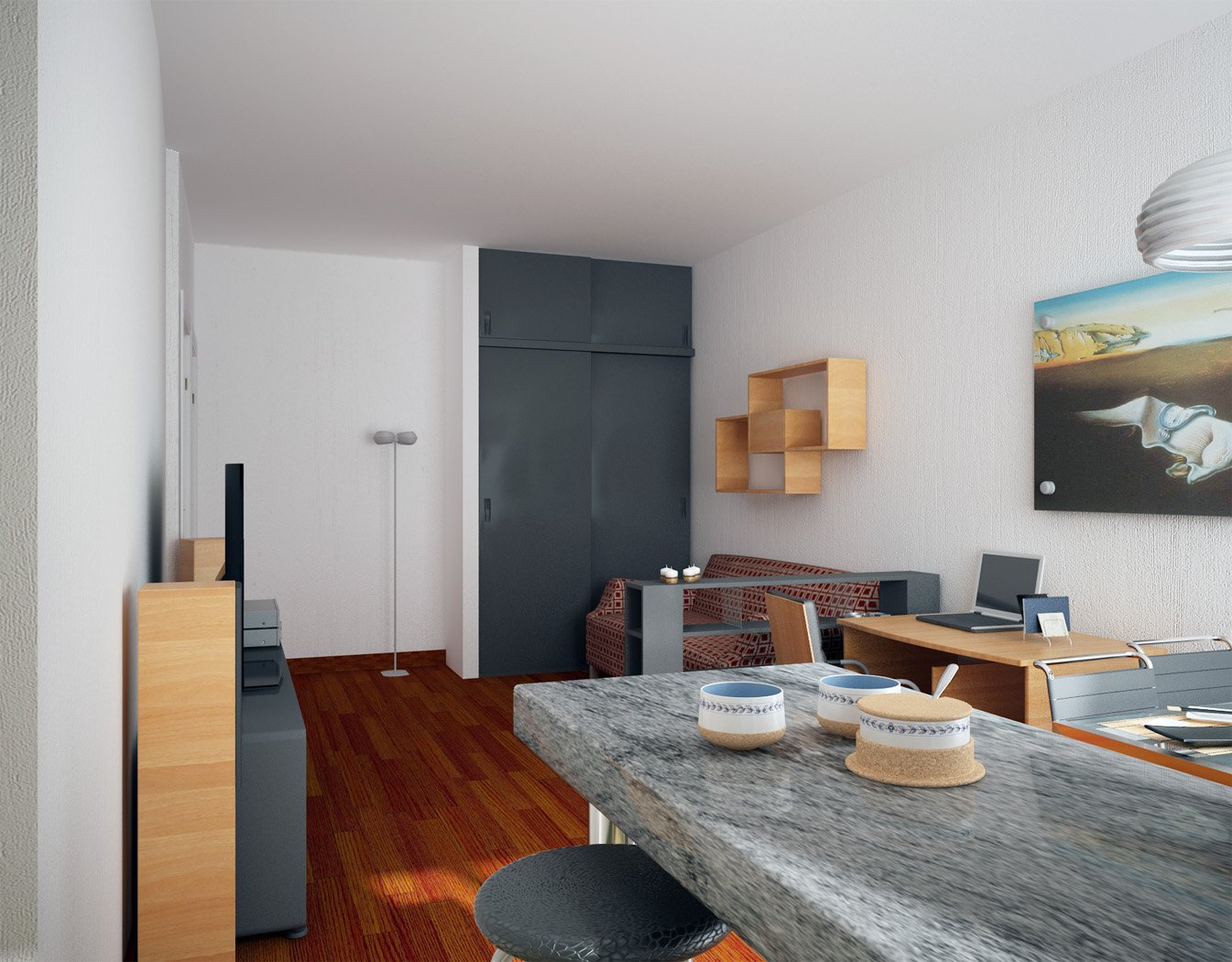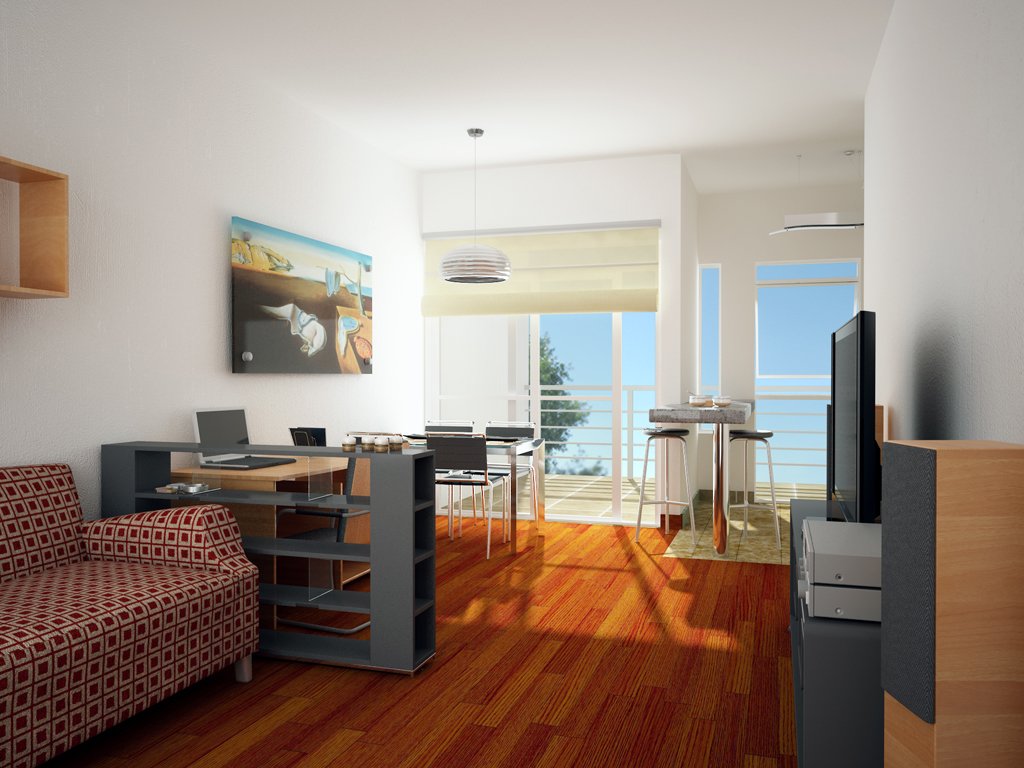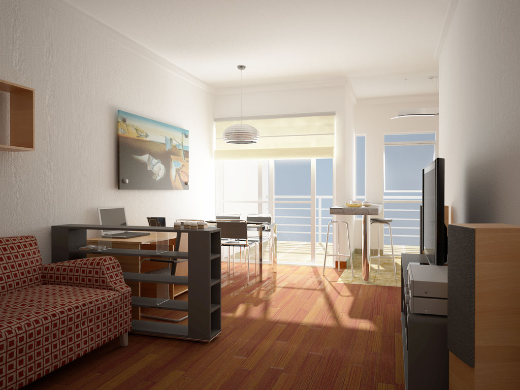 También estoy realizando trabajos de interiorismo, para eso estoy estudiando luces avanzadas en ordenador y es verdaderamente muy complejo, utilizo el max y hasta ahora solo luces estándares y luego empezaré ensayos con Vray, es cierto que tú render detalles tiene, como el del piso de madera muy saturado, la iluminación en todo el espacio y en las aberturas confunden no dejan apreciar bien en detalle el ambiente, las texturas del sofá en una parte se corta la textura de forma muy visible, según Karras:¿tu has visto alguna casa en el que el techo y la pared sean iguales y no se distinga dónde empieza una y acaba la otra? Lo cierto es que en lugares de ambientes pequeños se suele dejar que la calidad tonal de paredes y cielos rasos sean de color blanco para que simulen un espacio más amplio, pero en su intersección como detalle se suelen colocar molduras de yeso las que en tu composición no están presentes, esto despegarían e identificarían mejor a ambos, con respecto a la mesa de mármol tal vez deberías ajustar el box mapping, o prueba utilizar el Unwraping, espero lo tomes como un crítica constructiva, saludos y siempre para delante.