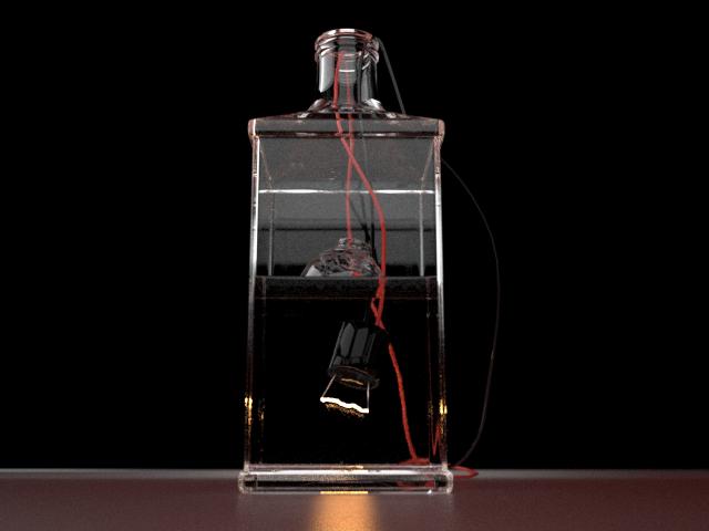 El caso es que la botella tiene un Shader de cristal igual que el de la bombilla, y dentro hay un sólido con material de agua. Como podéis ver la bombilla no se rendea cuando se encuentra bajo el agua. Curiosamente esto o pasaba cuando el sólido que constituye el agua era un poco más pequeño que el tamaño de la botella, pero no quedaba realista, por lo que lo escalé para que atravesara un poco el contorno del cristal de la botella y entonces la bombilla desapareció.