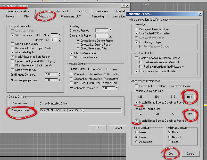 No tengo el 3ds Max delante, pero en configuración del driver del visor (OpenGl, DirectX) se puede configurar el tamaño de la textura de fondo.