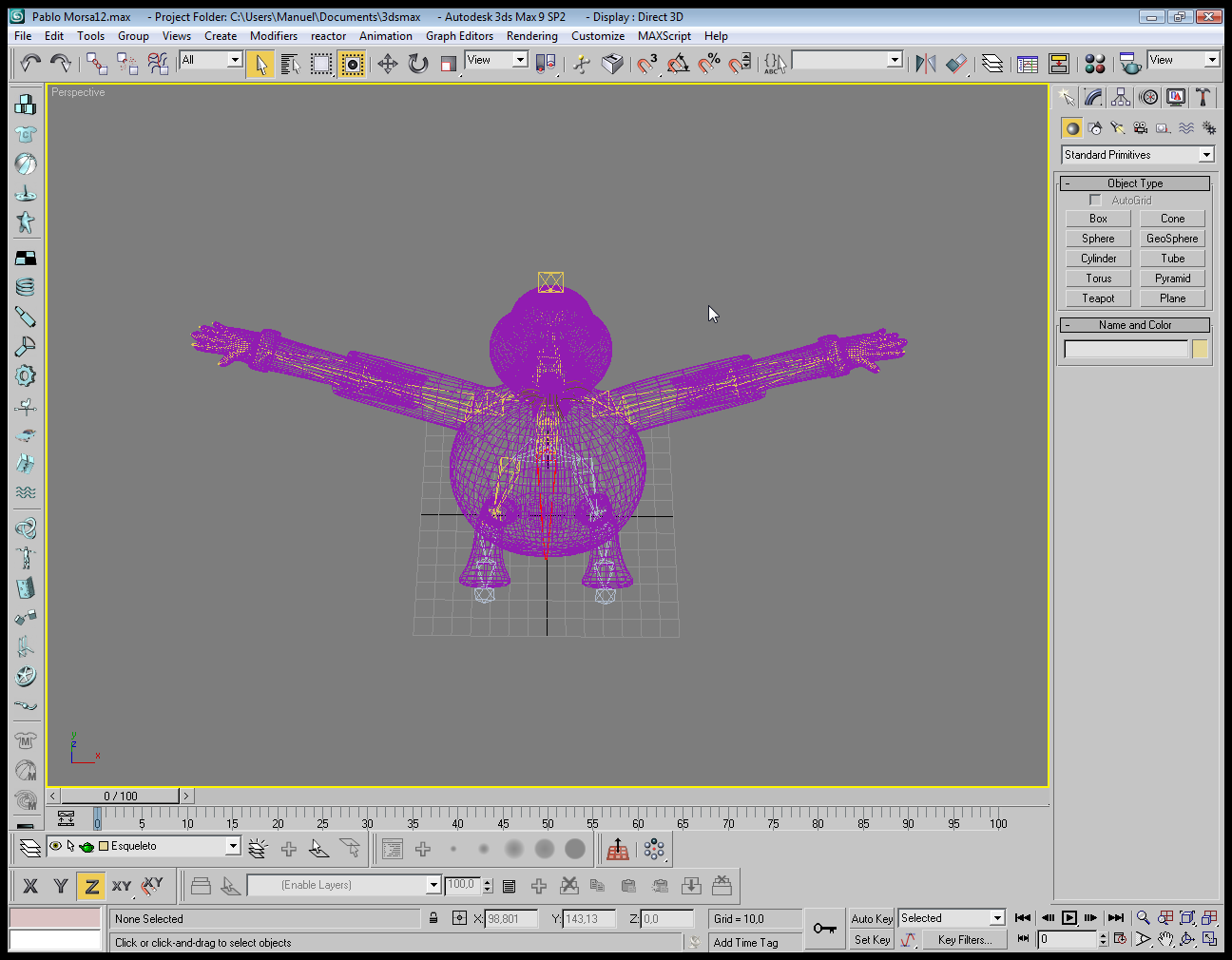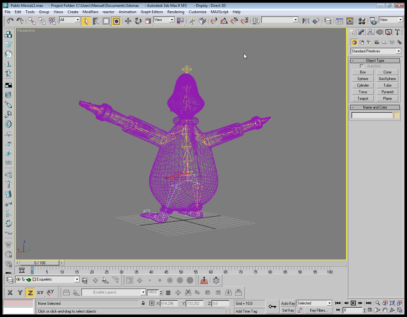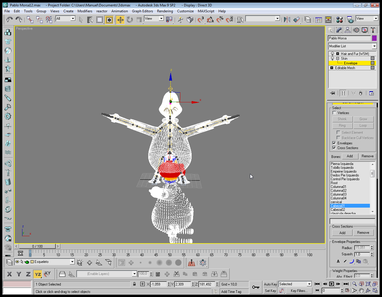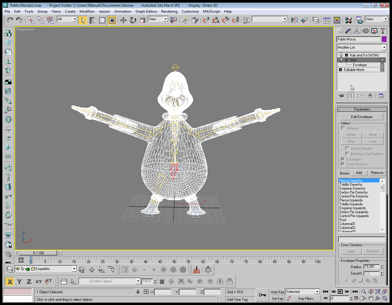 Aquí podrán ver el objeto, el esqueleto y el problema que me da en los envelopes. (ven donde se reflejan los vértices lo que hace obvio el que el modelo no se mueva ni afecte).