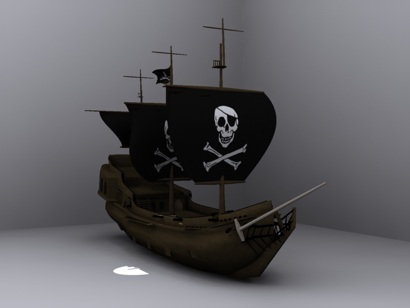 Aquí un barco pirata similar al Black Pearl. Hecho en 3dsMax 8 y renderizado con Mental Ray.