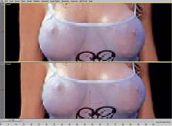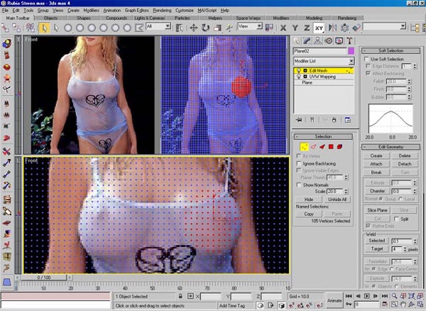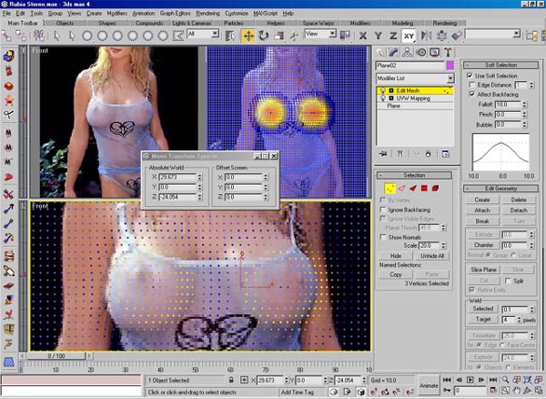 4-ahora viene lo bueno. Si seleccionamos el vértice del centro de un pecho, al desplazarlo sólo se movería la parte de imagen correspondiente a ese vértice, como nos ocurriría en Adobe Photoshop, por ejemplo. En max podemos añadir un campo de tiro definiendo el radio y el tiro para, por así decirlo, podamos obtener desde un cono hasta una esfera. En la imagen, un solo vértice seleccionado sin campo de tiro (llamado más propiamente software selección):