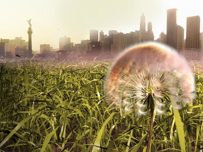 Completamente de acuerdo con lo del pasto, si le falta bastante trabajo, pero es que tenía que salir ya y pues ya no tenía tiempo, el diente de león está hecho en 3ds Max con Shag Hair, también el pasto es en 3ds Max, lo demás es en Adobe Photoshop, las ciudades de atrás, la de izquierda es la ciudad de México y la de la derecha es Nueva York, saludos.
