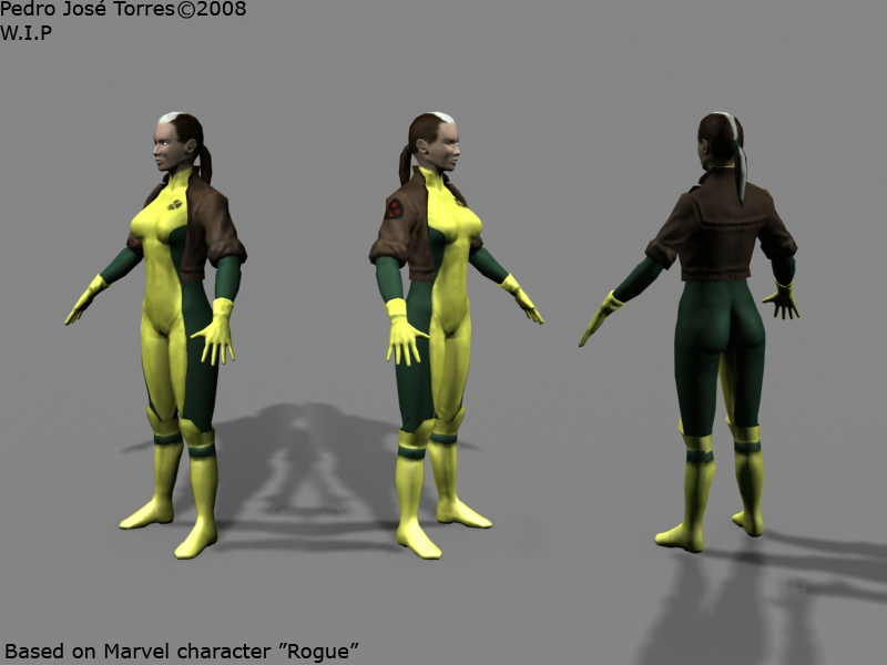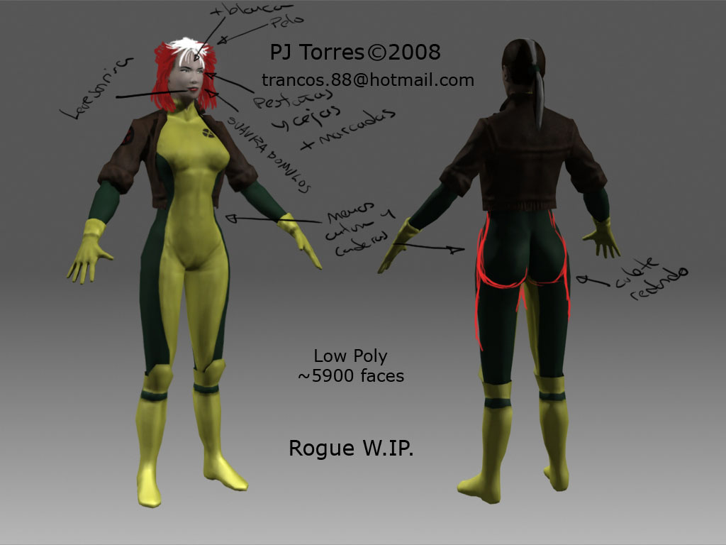 Bueno estoy haciendo un Low poly, en este caso voy a hacer una versión de pícara de X-Men. Aún no es definitivo le quedan texturas por retocar(tanto normales, como difusse).