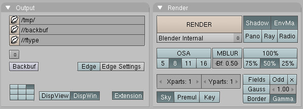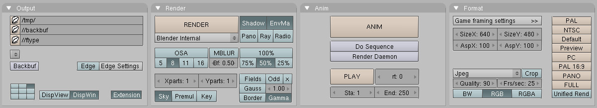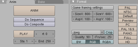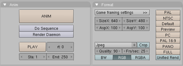 - seleccione avi Raw como el tipo de fichero que vamos a utilizar en el panel formato (format) (configurando los botones de renderizado para una animación.). Mientras que esto no es una buena elección generalmente, principalmente por problemas de tamaño de archivo (como se explicara más tarde), tiene la ventaja de ser rápido y funcionar en cualquier ordenador, así que, cumple nuestras necesidades. (puede también seleccionar el formato avi jpeg para obtener un fichero de un tamaño más reducido, pero utilizando la compresión por pérdidas jpeg y obteniendo una película que algún reproductor externo puede no ser capaz de reproducir).