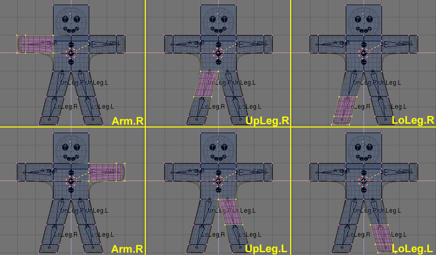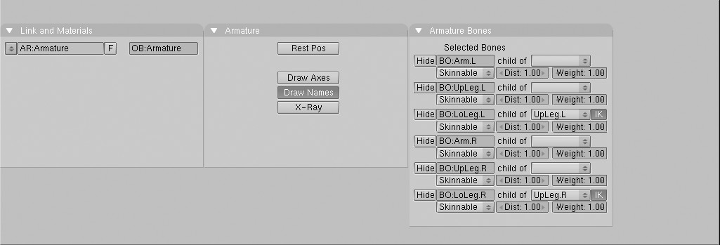 posición inicial: Blender recuerda la posición original de los huesos. Puede volver a poner el esqueleto (armature) en dicha posición simplemente presionando el botón restpues en el panel de botones de edición de esqueletos (armature edit buttons) (la ventana editar botones para una armadura.).