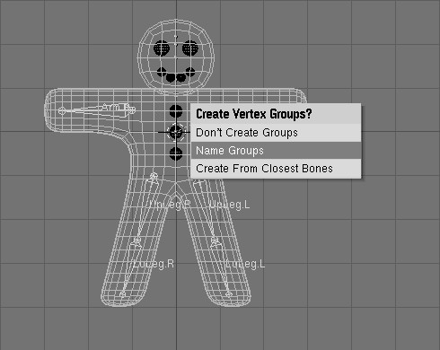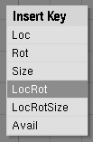 Seleccione todos los huesos con la tecla a. Con el puntero del ratón en la ventana 3d, presione la tecla i. Un menú emergerá asignando la postura al frame.. Seleccione locrot en este menú. Esto obtendrá la posición y la orientación de todos los huesos y los guardará en una postura en el frame 1. Esta postura representa a Gus en la mitad de la zancada, mientras esta moviendo su pierna izquierda hacia delante y sobre el suelo.