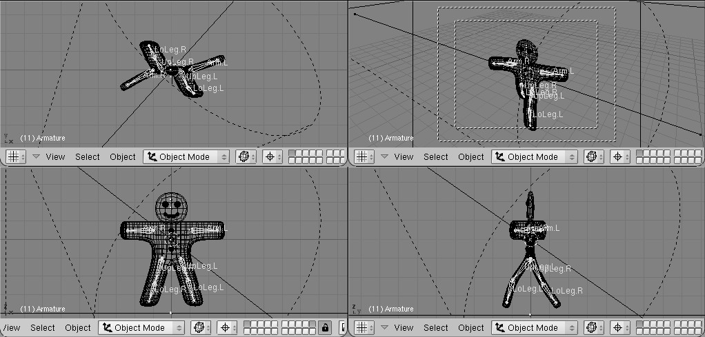 Ahora, rotando solo un hueso al mismo tiempo (tecla r), levantaremos upleg. L y doblaremos loleg. L hacia atrás mientras levantamos un poco arm. R y bajamos otro poco arm. L, tal cómo se muestra en nuestra primera pose..