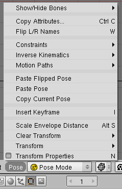 - ahora necesitamos una tercera postura en el frame 21, con la pierna derecha levantada, porque estamos en el medio de la otra mitad de la zancada. Esta postura es el reflejo de la postura que hemos definido en el frame 1. Otra forma sería, volver al frame 1 y en el menú armature en la cabecera de la ventana 3d seleccione la entrada copy pose (copiar pose) (copiando la postura al buffer.). Ha copiado la postura actual al buffer.