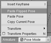 Vaya al frame 21 y pegue la postura con la opción paste flipped pose (pegar postura volteada) en el menú armature (pegar la copia como una nueva, y volteada, pose.). Este botón pegara la postura seleccionada, intercambiando las posiciones de los huesos con el sufijo. L con aquellos huesos que tienen el sufijo. R, efectivamente ¡dándolos la vuelta.