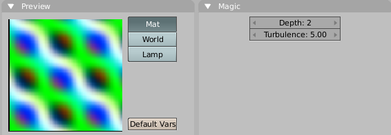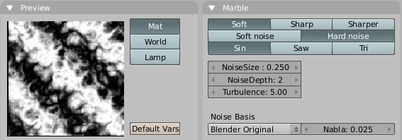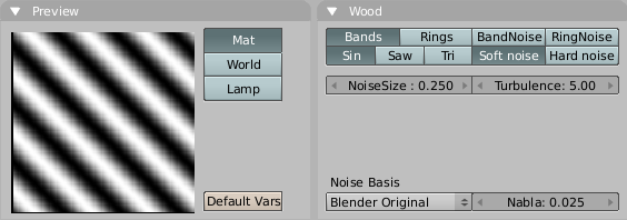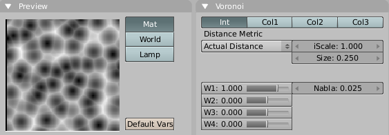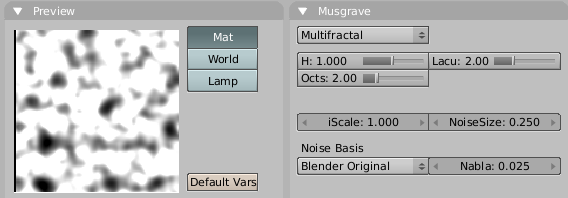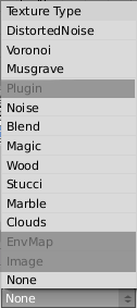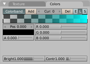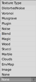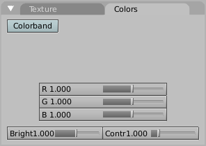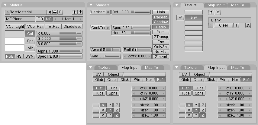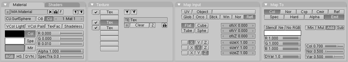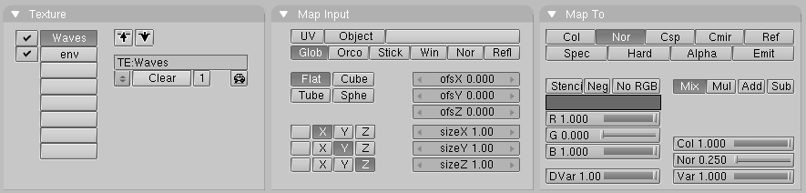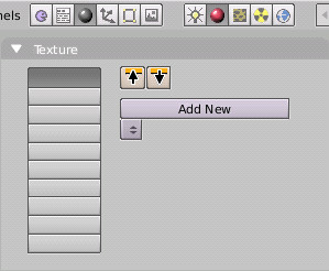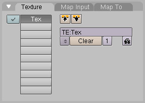 El panel texture (textura), a la derecha (y paneles similares existentes para los botones de luces y mundo), definen todos estos cálculos. Para un material sin texturas, el panel muestra una columna de diez canales de textura vacíos (panel de textura vacío). Seleccionando uno de estos canales y presionando add new, o seleccionando una textura existente con el botón de menú justo debajo, se agrega una textura y el panel muestra dos etiquetas más: Map Input y map todo (panel texture con una textura.).
