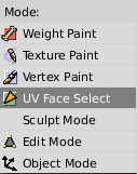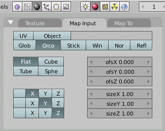 - stick: utiliza las coordenadas locales sticky (pegadizas) del objeto. Si se han hecho coordenadas sticky previamente (botón f9->panel Mesh->sticky), la textura se renderiza en vista de cámara (también llamado mapeado de cámara).