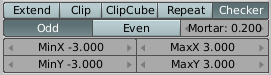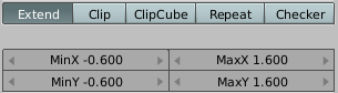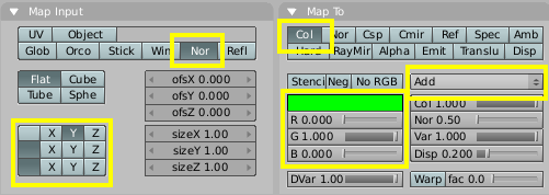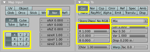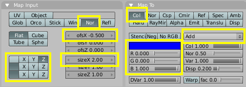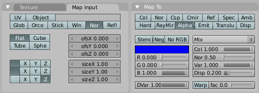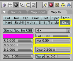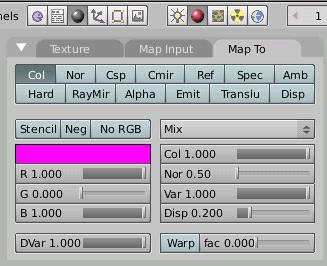 Las filas superiores del panel map to muestran los botones conmutadores que determinan que característica del material se verá afectada por la textura. Algunos de estos botones tienen tres estados, puesto que la textura puede aplicarse de forma positiva o negativa. Todos estos botones son independientes entre sí.