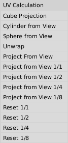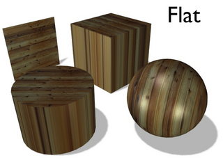 - el mapeado plano (flat) (mapeado plano) da los mejores resultados para caras planas simples. Produce efectos interesantes al aplicarlo sobre una esfera, pero comparado con una esfera mapeada con el mapeado esférico, el resultado se ve chato. Sobre caras que no están sobre el plano del mapeado, el último píxel de la textura se repite, lo que produce bandas al usarlo sobre un cubo o un cilindro.
