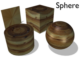 El mapeado cúbico (mapeado cúbico) normalmente da los mejores resultados si se usa sobre objetos que no son demasiado curvos u orgánicos (nótense las costuras sobre la esfera).