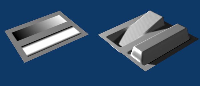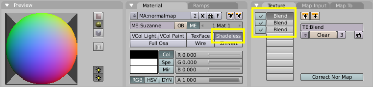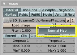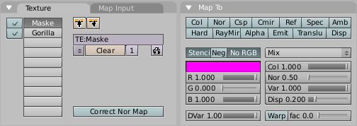 - correct Nor map: (corregir mapa normal) en algunos casos - Especialmente en mapas invertidos (xy), en el panel Map Input, un mapa Bump (relieve) apunta en la dirección equivocada. Conmute este botón para corregir el mapeado Bump (el botón pertenece lógicamente al panel Map Input, pero se incluye aquí).