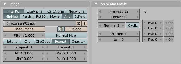 - botón-num: muestra el número de objetos que usan esa textura. No puede crearse una copia de usuario único aquí, ello debe hacerse en los botones textura (f6).
