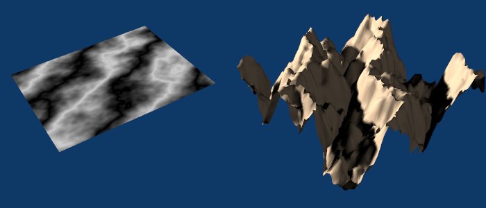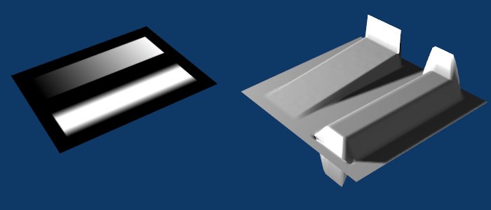 Use esta textura como un mapa stencil (máscara), el cual mantendrá la textura pronunciada (ajustes de material para texturas dependientes de la pendiente). Con los ajustes mostrados el terreno se levanta en la dirección z.