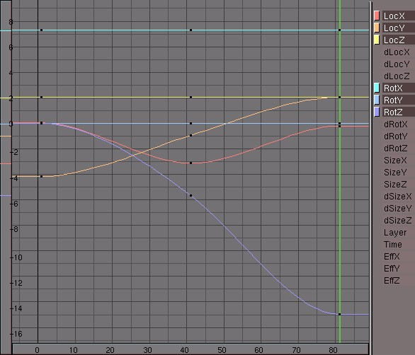 {{note|haz rotar un objeto| éste es el mejor método para especificar ejes de rotación rápidamente: selecciona el objeto, en la ventana IPO, pulsa uno de los canales root y utiliza Control-LMB para insertar dos puntos. Si el eje de rotación ha de ser continuo, debes usar la entrada del menú curve>>extend mode>> extrapolation.