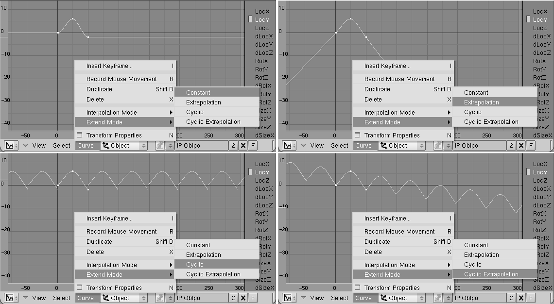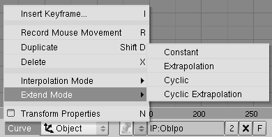 También es importante especificar cómo una curva ipo debe ser interpretada desde fuera de la misma curva. Hay cuatro opciones para esto en el submenú curve>>extend mode de la cabecera de la ventana ipo (ipo extensión options.).