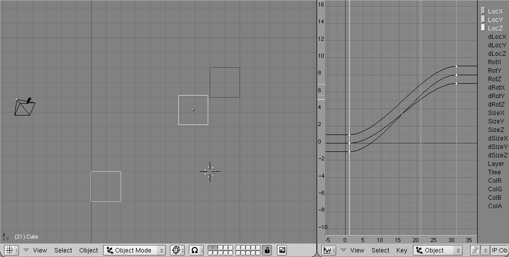 nos movemos 30 fotogramas más lejos (pulsando tres veces la arriba) y movemos el objeto. De nuevo usamos tecla-i. Ahora podemos pulsar inmediatamente enter para que Blender recuerde nuestra última opción y la seleccione. La nueva posición se inserta en la curva ipo. Podemos verlo lentamente volviendo hacia atrás a través de los cuadros (derecha). El objeto se mueve entre las dos posiciones. En este caso, puedes crear la animación moviéndote a lo largo de los cuadros, posición por posición. Observa que la posición del objeto es directamente enlazada a las curvas. Cuando cambias fotogramas, las Ipos son siempre revalúadas y reaplicadas. Puedes mover libremente el objeto en el mismo fotograma, pero tan pronto como cambies de fotograma, el objeto salta a la posición que había sido determinada por el ipo. La rotación y el tamaño del objeto son completamente independientes en este ejemplo. Pueden ser cambiadas o animadas con el procedimiento de insertar clave seleccionando del menú que aparece al pulsar la tecla-i las otras opciones como rotación (rotation), tamaño (size) y cualquiera de sus combinaciones.
