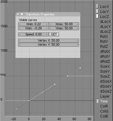 Cada tipo de bloque ipo tiene un número fijo de canales disponibles. Cada uno tiene un nombre (locx, sizez, etc.) que indica cómo se aplican. Cuando añades una curva ipo a un canal, la animación empieza inmediatamente. A tu albedrío (y hay canales separados para ello), una curva puede ser enlazada directamente a un valor (locx), o puede aplicarse a un incremento del mismo (dlocx). Éste último te permite mover un objeto tal y cómo se haría normalmente arrastrándolo con la tecla g, sin interrumpir la ipo. La posición actual se determina entonces con curvas ipo relativas a esa posición.