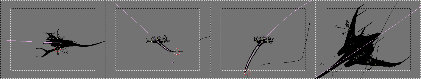 Para visualizar precisamente esas rotaciones, debemos posibilitar que un hijo tenga sus propias rotaciones. Elimine la rotación del hijo con alt-r. También elimine la parent inverse:alt-p. El mejor método es emparentar un hijo sin rotación a la trayectoria con el comando shift-Control-tecla p: make parent without inverse (hacer padre sin inversa. Ahora el hijo salta directamente a la trayectoria y los puntos del hijo están en la dirección correcta. Las trayectorias tridimensionales tienen un valor extra por cada vértice: el tilt (inclinación). Esto puede ser usado específicamente en la rotación de un eje. Use la tecla en modo edición para cambiar el tilt de los vértices seleccionados en modo edición, por ejemplo, para tener un hijo moviéndose alrededor como si fuera una peonza. La trayectoria compleja de animación muestra una aplicación compleja. Queremos hacer que un avión vaya a través de un cañón, volando próximo al agua y entonces levante el vuelo, todo esto siguiéndolo con nuestra cámara y, posiblemente, teniendo reflejos en el agua. Para conseguir esto necesitaremos tres trayectorias. La trayectoria 1 tiene un avión emparentada a ella, es decir, el avión volara siguiéndola.