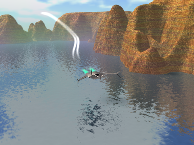 Desde que nosotros queremos que nuestro avión sobrevuele un río, necesitaremos configurar un mapa entorno para obtener reflejos de la superficie del agua. Pero el Empty usado para los cálculos siempre tiene que estar en una posición especular con respecto a la cámara. Y la cámara se está moviendo a lo largo de una trayectoria. La trayectoria 3 es por lo tanto creada como un espejo de la trayectoria 2 con respecto al plano el agua, duplicandola, y usando la tecla m, en modo edición con respecto a cursor, una vez que cursor esté en el plano. El Empty para el cálculo del mapa de entorno es entonces emparentado a su nueva trayectoria, y la ipo-tiempo de la trayectoria 2 es copiada a la trayectoria 3. La una imagen de la animación final. nos muestra una imagen renderizada. Algunos sistemas de partículas se usaron para crear la estela. La escena presenta muchos trucos pequeños, como las partículas para los motores del avión, la niebla, un cielo añadido a una esfera rodeando la escena y así.
