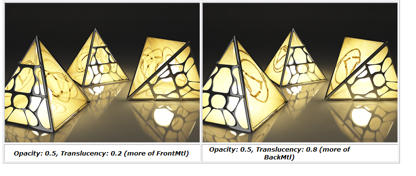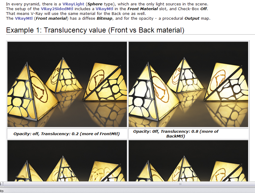 Hola. Estoy estudiándome el manual de Vray y llegue a un punto conocido como vray2sidedmt (material translúcido,) pero he visto unos ejemplos que trae incluidos y no entiendo ciertos parámetros, la verdad no consigo los mismos resultados que muestran en los ejemplos, empezando por la opacidad.