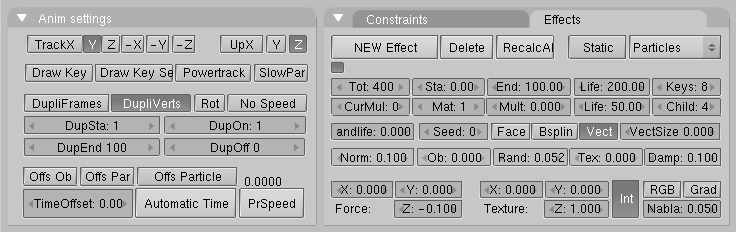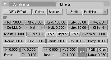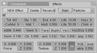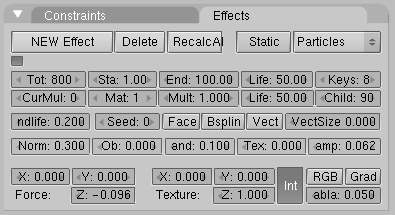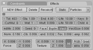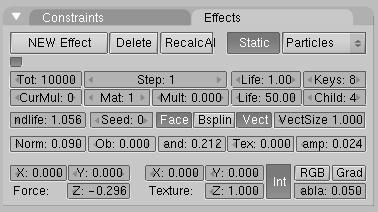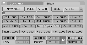 - el número total de partículas indicadas en el botón tot: se crean uniformemente a lo largo de un intervalo de tiempo. Dicho intervalo esta definido por los numbuttons sta: y end:, que controlan el frame de inicio y el final en el que las partículas son generadas.