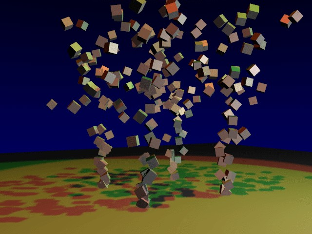 Colocando las partículas con duplivert, usted podría querer reducir el número de partículas presionando alt-a (colocando las partículas con duplivert.). En la animación se dará cuenta que todos los cubos comparten la misma orientación. Esto puede ser interesante, pero también puede serlo tener los cubos orientados aleatoriamente. Esto lo podemos hacer seleccionando la opción Vect en los parámetros de partícula, que causa que los dupli-objetos sigan la rotación de las partículas, resultando un movimiento más natural (colocando las partículas con duplivert.). Podemos ver un frame de la animación (renderizado de partículas con duplivert.).