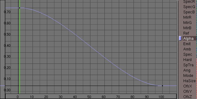Textura de las llamas, si ahora hace un render de prueba, vera que solo puede ver una brillante llama roja. Para darle un toque más realista, necesitaremos una textura. Mientras el emisor siga seleccionado, vaya al panel de texturas (texture panel) y añada una nueva textura del tipo nube (cloud), en los botones de textura (f6). Ajuste el tamaño de ruido (noise size a 0.600. (textura de las llamas). Vuelva a los botones de material f5 y haga el color de textura a un amarillo con los deslizadores RGB en el lado derecho de los botones de material. Para ajustar los puntos amarillos en la textura de nube, disminuya el valor de tamaño y (sizey) a 0.30. Un render de prueba ahora nos mostrara un bonito fuego. Pero seguimos necesitando crear partículas apagándose en lo alto del fuego. Podemos conseguir esto con una animación del alpha y del tamaño del halo del material. Asegúrese que su animación está en el frame 1 (shift-leftarrow) y mueva el ratón hasta la ventana de materiales. Ahora presione la tecla ikey y elija alpha del menú emergente. Avance el barra de tiempos hasta el frame 100, e introduzca un valor alpha de 0.0 e inserte otra clave para el alpha con la tecla ikey. Cambie una de las ventanas a una ventana ipo. Active el tipo de material ipo haciendo click en la sección del menú correspondiente. Ahora vera una curva del canal alpha del material (material ipo del fuego.). .