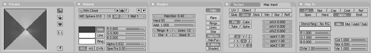 Los botones de material cambian a los botones de halo. Elija line, y ajuste lines: a un valor de su elección (puede ver el efecto directamente en material-preview). Disminuya halosize: a 0.30, y elija un color para el halo y para las líneas (propiedades del halo.). Ahora puede renderizar una imagen con f12, o una animación completa y ver miles de estrellas volando alrededor (estrellas disparándose.).