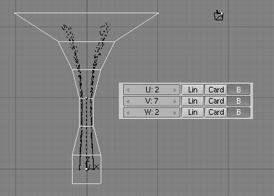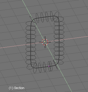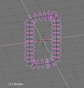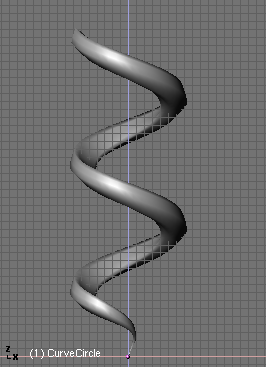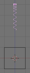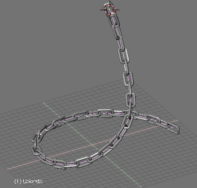 Si ahora activamos dupliframes veras la silueta de un bonito tirabuzón. (usando un camino curva para modelar la cadena.). Una vez más los últimos pasos son: make duplis real, unir las superficies, seleccionar todos los vértices y hacer el skinning, invertir la dirección de la normal si es necesario y salir de modo edición (usando un camino curva para modelar la cadena.).