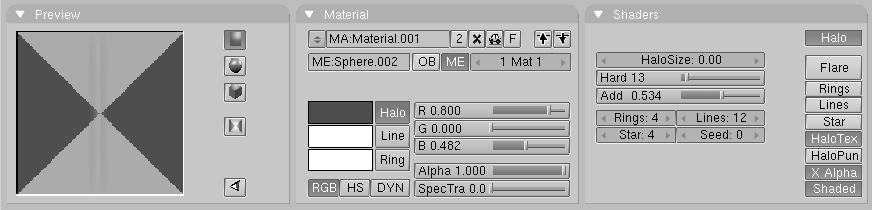 Cuando renderice los fuegos artificiales, no parecerán muy impresionantes. Esto es debido al material estándar de halo asignado por Blender. Por lo tanto, el siguiente paso es asignar un mejor material. Asegúrese que tiene el emisor seleccionado y vaya al panel de sombreado (shading context) y a los botones de material (f5). Añada un nuevo material con botón de menú, y seleccione el tipo halo.
