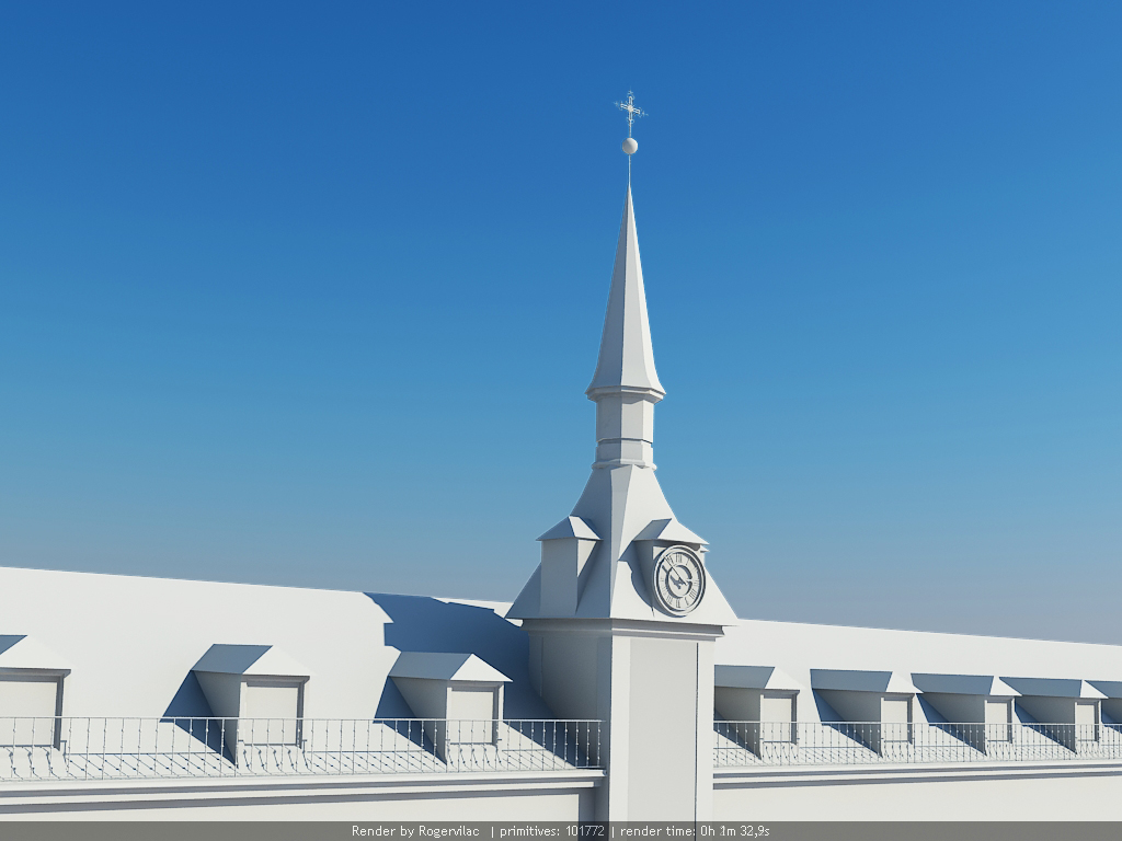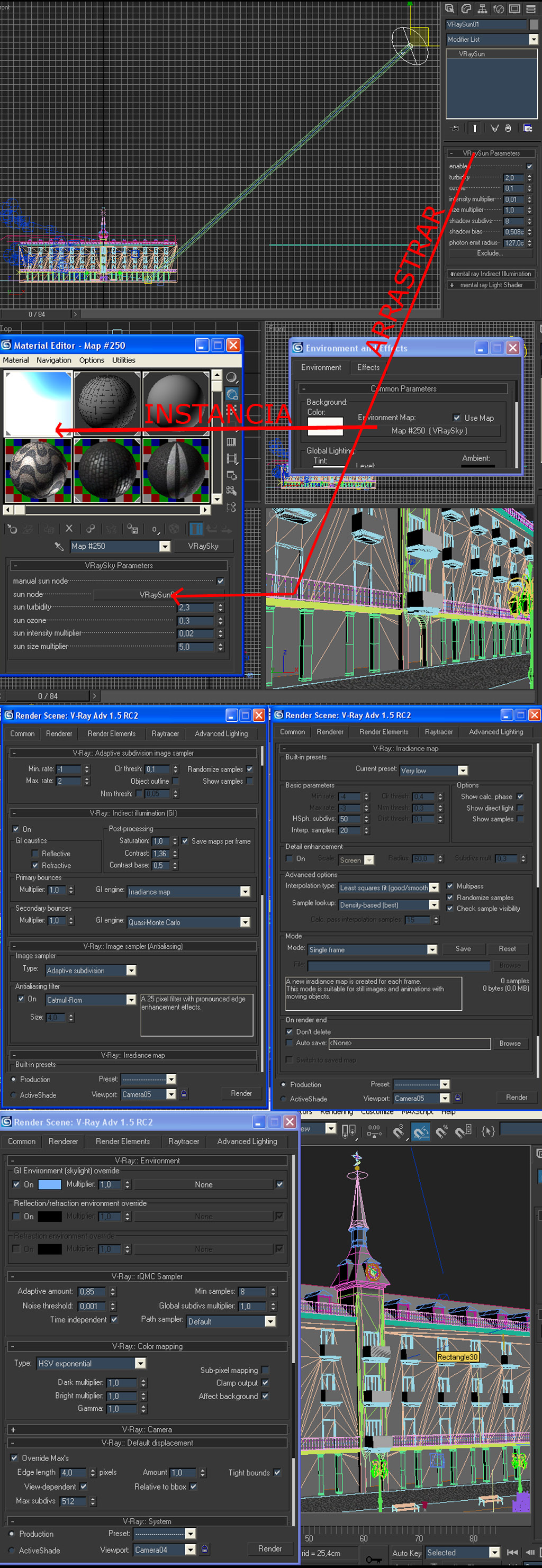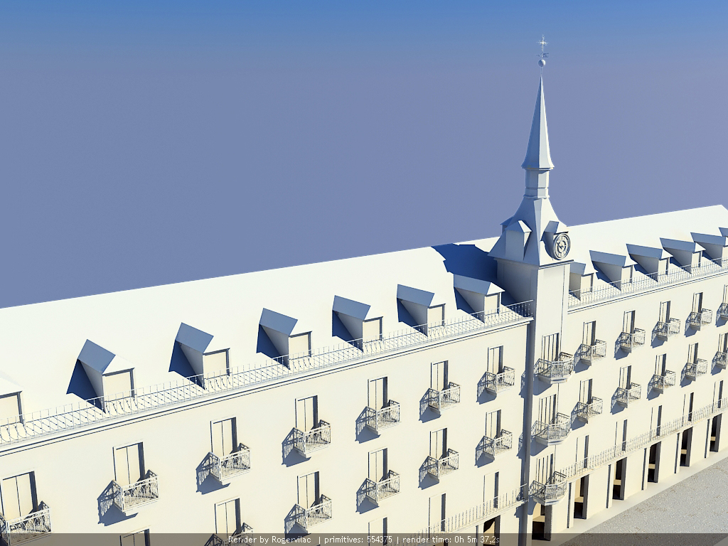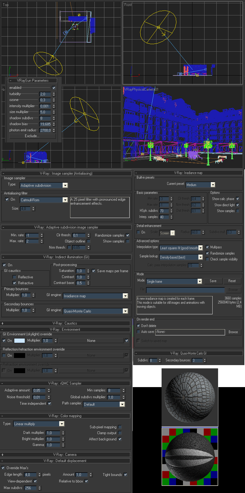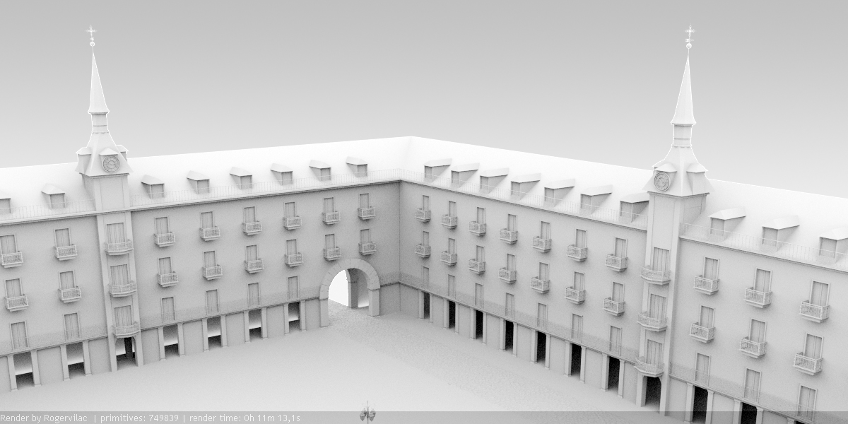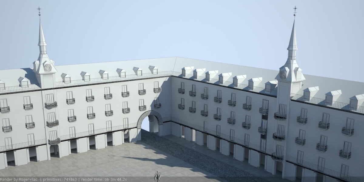 Hola Roger, que tal, está muy bien el modelo, tiene un curro bueno, en el tema de la iluminación, me gusta más la de la primera imagen, ya que se ven iluminada las dos fachadas y por lo tanto todos los elementos salientes hacen sombra, pero bueno eso es cuestión de gustos, he mirado tus settings y en el Irradiance Map yo marcaría la casilla de chek sample visibility, te puedes ahorrar algunos artefactos, y la verdad es que las subdivisiones están altas para un exterior, creo que con 50 30 te daría una calidad muy parecida a la que tienes ahora mismo.