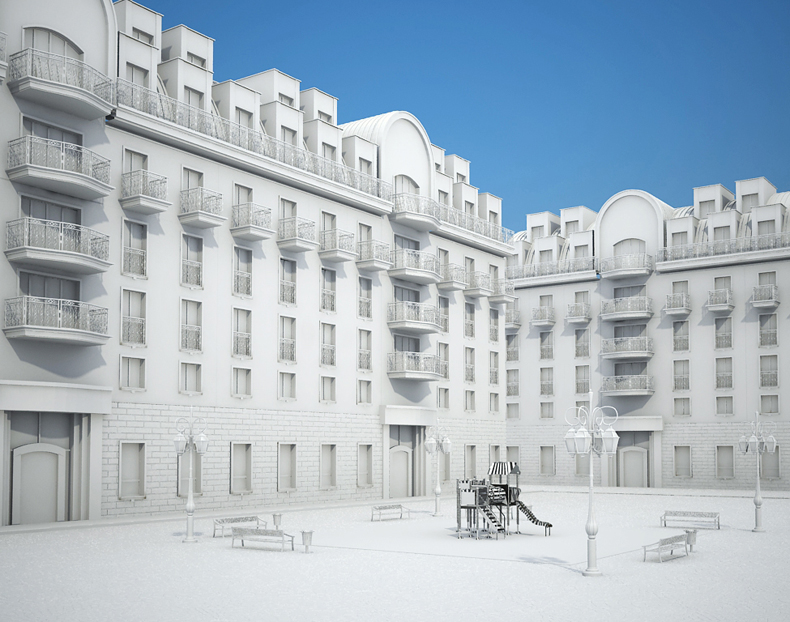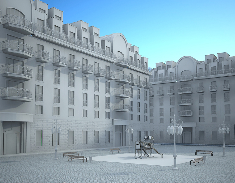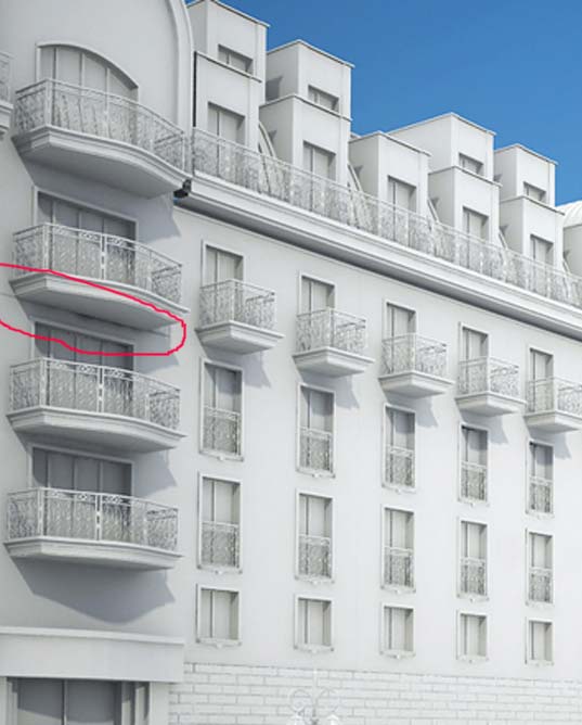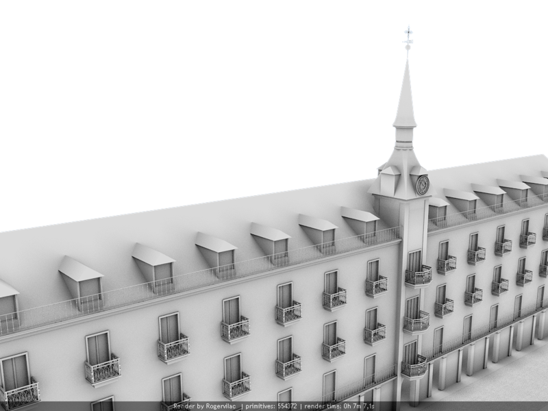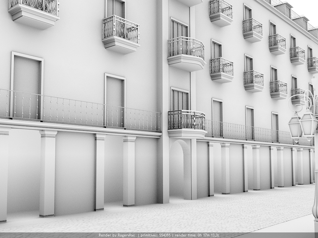 Disinim: los balcones son independientes, creados con Splines renderizables y algún objeto Low poly para detallar más el balcón.
