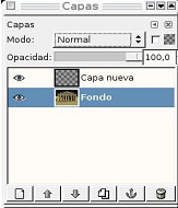 En Gimp no hay una única forma de hacer las cosas. La interfaz proporciona conjuntos de herramientas y opciones en varias apartados del programa. A veces, las herramientas se repiten. La idea que hay detrás de esta situación, es la de proporcionar varios métodos de trabajo distintos, y que un usuario nobel encuentre fácilmente lo que busca (incluso, aunque que no haya acudido al lugar adecuando). En el menú diálogos / capas encontramos un panel especialmente diseñado para trabajar ágilmente con capas (fig. 19). Es recomendable utilizarlo, aunque es necesario saber que el menú capas dispone de algunas opciones adicionales.
