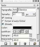 por último, tenemos la herramienta de texto. También esta presente en la caja de herramientas. Es un pequeño editor de texto (fig 22). Escribimos dentro de la ventana y el resultado se manifiesta en la imagen. Si seleccionamos la herramienta de texto en la caja de herramientas (el icono tiene una t) obtendremos una nueva ventana, mediante la cual podremos cambiar la tipografía, el tamaño y color, etc (fig. 23).