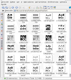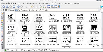 bueno, las tipografías que copiemos en estas carpetas (siempre y cuando sean tengan el formato correcto) podrán ser utilizados por la mayoría de los programas del sistema. Pero no por Gimp, que dispone del siguiente directorio para sus tipografías: /home/Antonio/.Gimp*2.2/fonts, en este caso /home/Antonio es el directorio del usuario y, Gimp es una carpeta oculta (va precedida por un punto). Las carpetas ocultas se pueden ver activando un botón para tal fin en el explorador de archivos que utilicemos. Cualquier tipografía truetype que copiemos en la carpeta fonts estará disponible en Gimp. No es una gran desventaja, en realidad. Evitamos cargar al sistema con montones de tipografías. Tipografías defectuosas pueden causar problemas graves a los sistemas operativos. Para ampliar la información sobre este tema dispongo del siguiente tutorial: http://www.elviajero.org/antoniux/tutoriales/guia2.pdf.