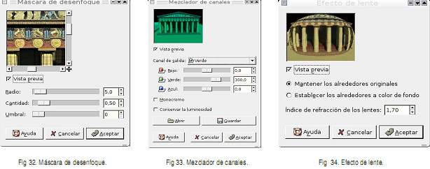 bien. Con ello ya hemos visto los aspectos más destacados del menú diálogos. Así que pasamos al menú filtros. Los filtros son efectos que se pueden aplicar sobre las imágenes. Estos pueden ser desde un sencillo efecto de desenfoque hasta un complejo programa de iluminación. Gimp incorpora un gran número de filtros en la instalación por defecto, pero pueden encontrarse muchos más en internet. Los filtros expanden notablemente las posibilidades del programa. Experimentar con ellos es siempre interesante. Vamos a ver los más importantes para hacernos una idea de las posibilidades creativas que nos ofrece el programa. Empezamos. Los filtros de desenfoque son para difuminar las imágenes (fig 32). Son necesarios a veces para ocultar tramados, o para suavizar sombras. El desenfoque Gaussiano es el más potente. El desenfoque de movimiento difumina en el ángulo que deseemos. Es muy apropiado para fondos y para simular el viento. Los filtros de color son muy numerosos y de utilidad desigual (fig 33). El llamado mapa es el más completo de todos. Permite sustituir colores y modificar los valores de los canales.