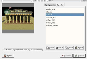 El segundo (script*fu), es el más interesante. Contiene gran cantidad de scripts ordenados por temas. Gracias a ellos podemos generar de forma automática logotipos, botones, brochas, texturas, temas para páginas web, etc. La mayoría de los scripts tienen opciones de configuración para que los usuarios puedan adaptarlos a sus necesidades.