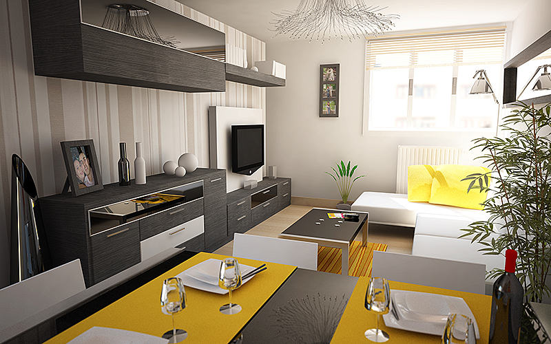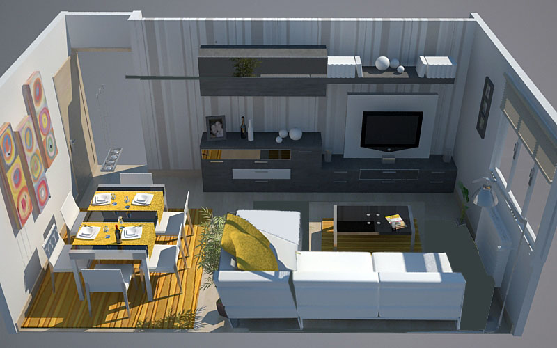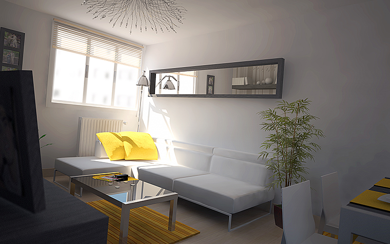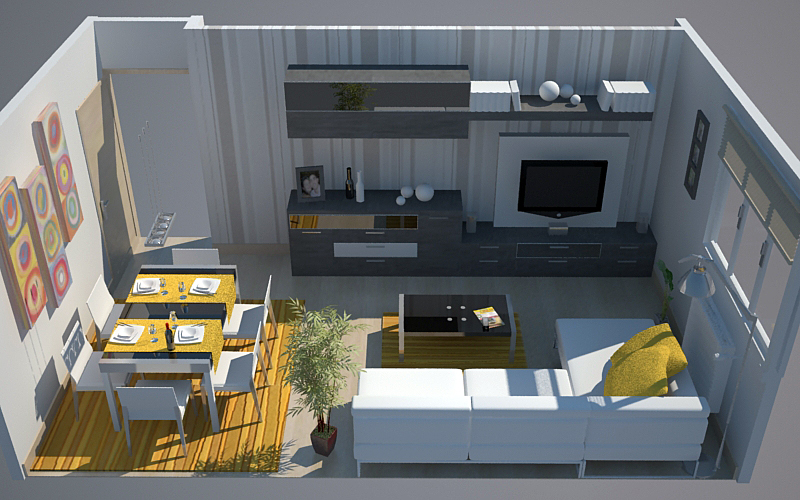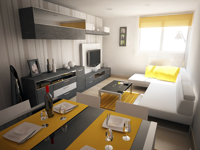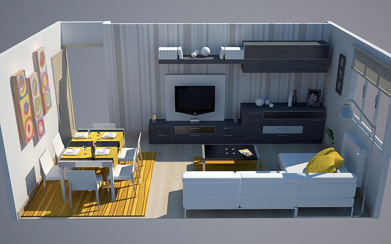 Hay tantas cosas que mejorar que no espero comentarios técnicos. Solo os lo enseño porque me apetece, para una vez que hago algo en 3d que se note aunque si me dieseis una pista sobre cómo se quita ese mancha de luz tras el sofá tampoco me iba a quejar.