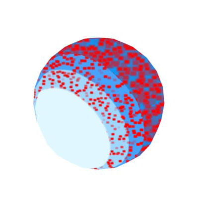 Para que se entienda un poco mejor, imaginad en la escena 3d esa esfera con puntitos. Con el material tal como lo tengo, las luces de la escena no le afectan, puesto que eso esta controlado desde el nodo normal. Por consiguiente, por mucho que gire la esfera (o la cámara alrededor de ésta) el material no cambia de aspecto, ni tampoco el aspecto de su iluminación. El efecto es el mismo que si la esfera estuviera enlazada al punto de vista del render.