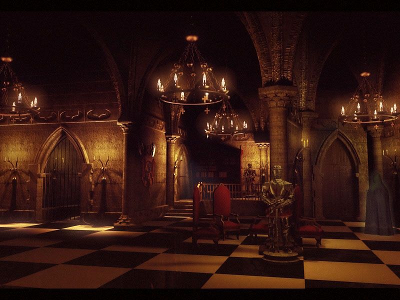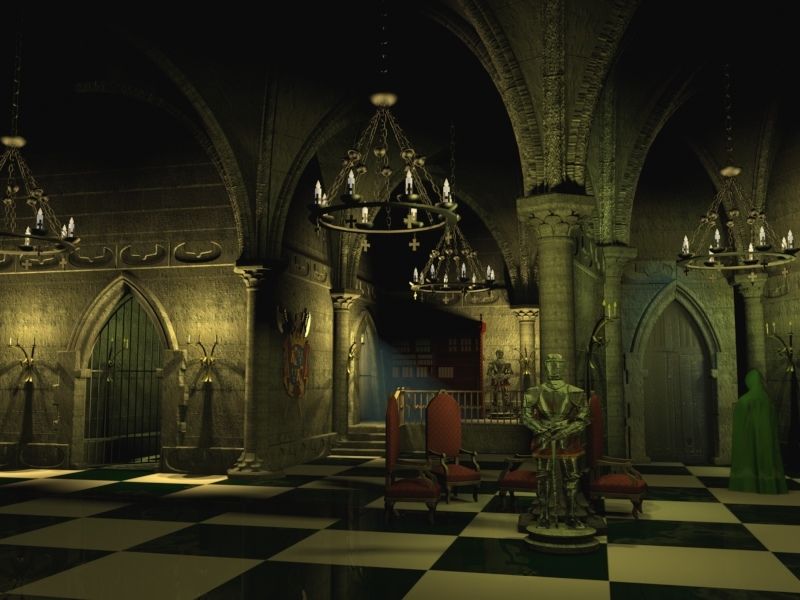 Y ya puestos, la armadura me parece poco cañera, así que no la pondría en primer plano, quitaría al fantasma y la pondría en su lugar, y añadiría además del suelo de Zazezi algún escudo familiar por las paredes, o que lo sujetase una armadura de igual forma que la espada.