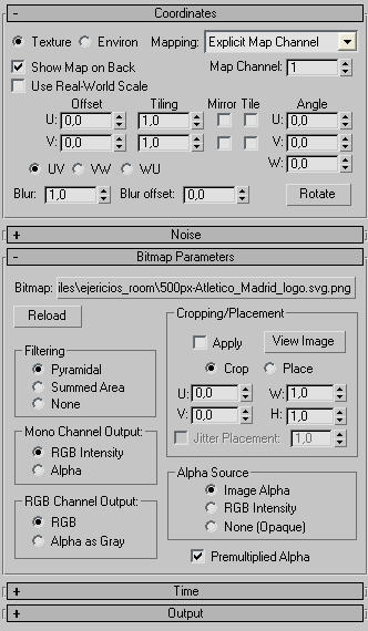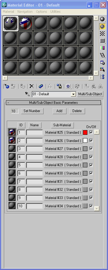 Bueno te explico. Tienes un multisubobject, con 2 i, d, una roja y una blanca por ejemplo. Ahora en el Diffuse de cada una de ellas, le pones el mismo ikono (logotipo, dibujo, escudo) este ikono tiene que tener alpha, para que no salga el típico marco de la fotografía, y en las gradas, tienes que ponerle un UVM mapping planar, sitiándolo de tal forma que proyecte el mapa donde tu quieres, a la imagen del ikono le quitas los tiles para que no se te repita la imagen. Aquí te dejo unas capturas para que te ayuden a comprender lo que explico.
