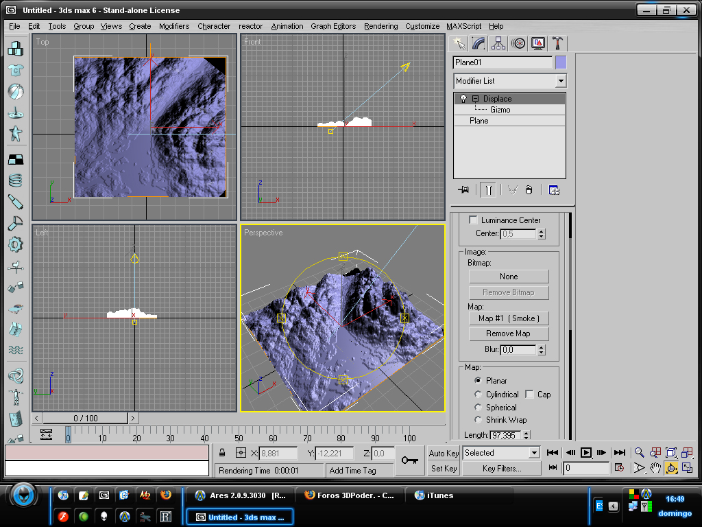Saludos. Estoy haciendo un terreno montañoso, pero cuando intento renderizar no se ve. Os adjunto las imágenes, lo que tendría que ser (terreno elevado) y lo que se ve (no se ve). Un saludo.