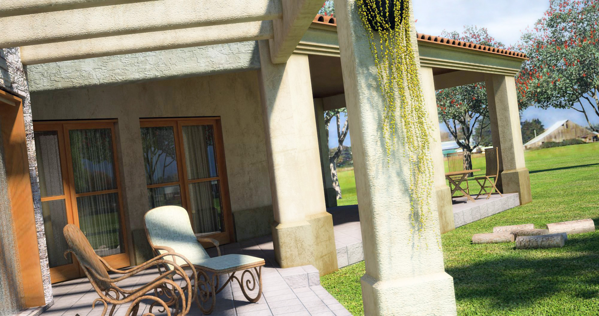 Las texturas están muy buenas, me agrada el estucado deteriorado que se obscurece más en la basa de las columnas, las ventanas, el cristal y las cortinas detrás, aunque me da la impresión de que le falta algo de Bump a la mampostería alrededor de la puerta a la izquierda, el material de la estructura de las mesedoras no se identifica bien, el piso se ve muy bien, pero me luce algo extraño que ese mismo material forme la contrahuella de los escalones y todo el borde de alrededor de la terraza que baja hasta la grama. Los troncos son un buen detalle, yo los distorsionada con el modificador noise para hacerlos menos cilíndricos, finalmente diría que hiciste un gran trabajo con el fondo (se nota un tanto por el desenfoque e la fotografía) y la grama me gusta.