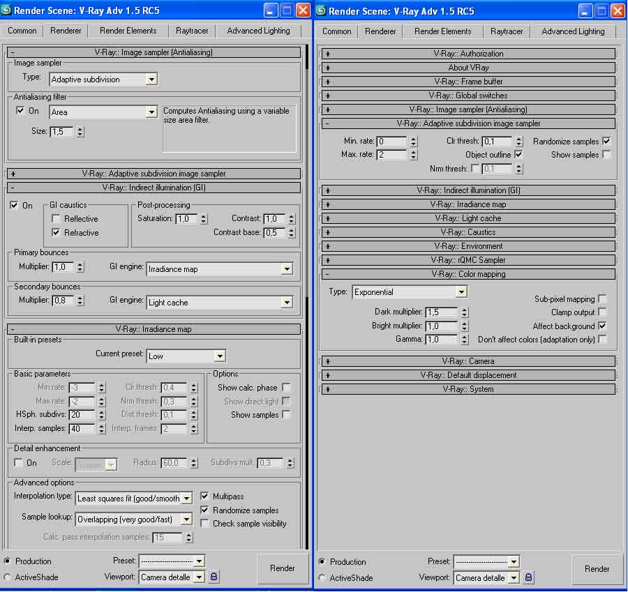 Os pongo aquí los dos render con idéntica iluminación, los parámetros (idénticos, solo cambia los secondary) y la disposición de las luces. Se me olvidaba decir que es Vray 1.5 y max 9, y también que en la escena hay un sol fotométrico (aún no se usar el Vray Sun).