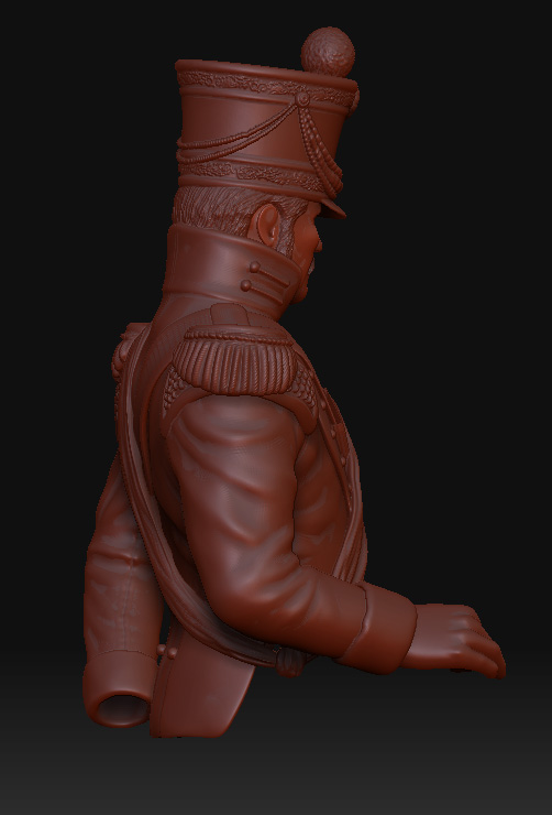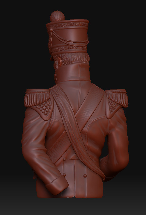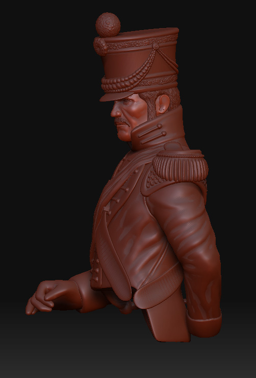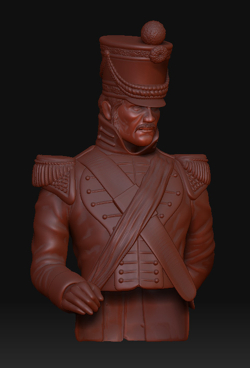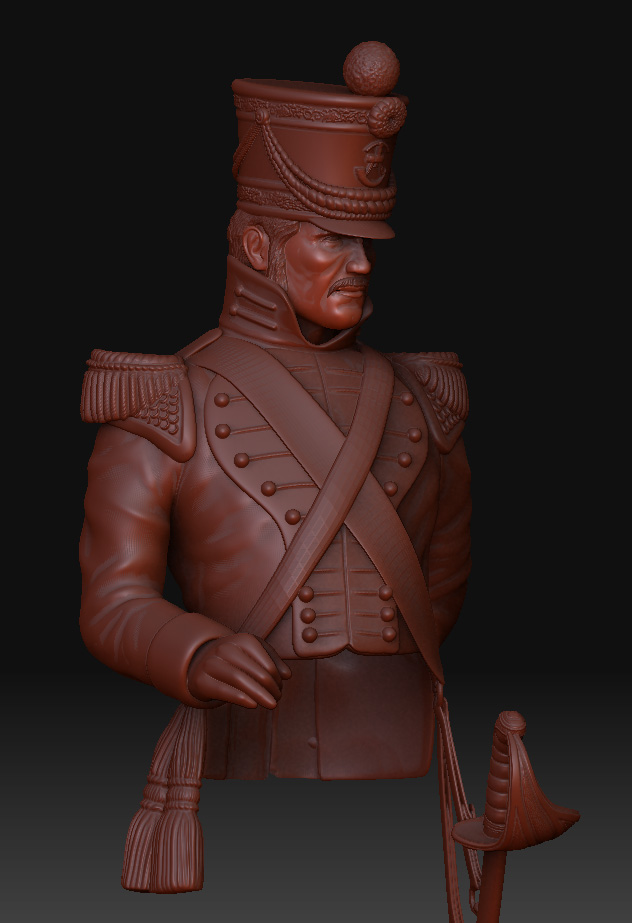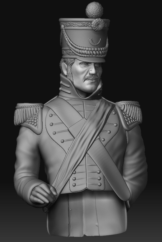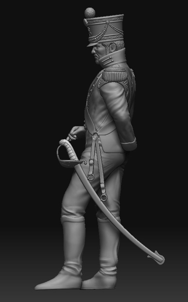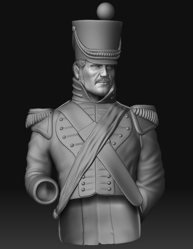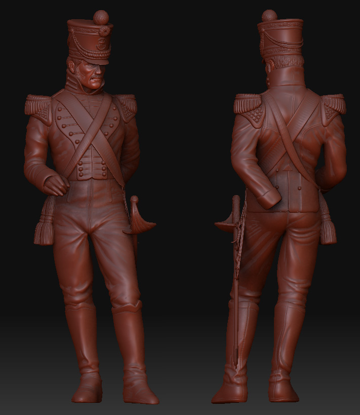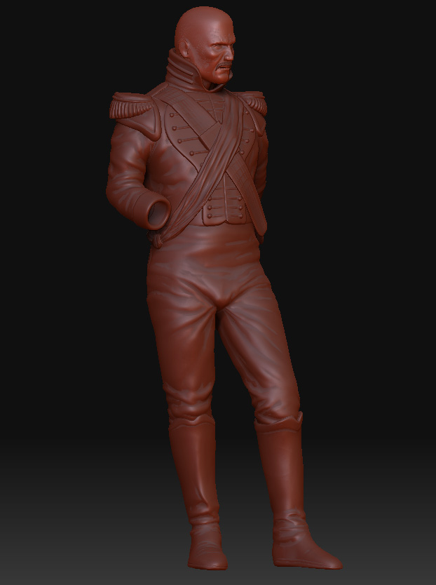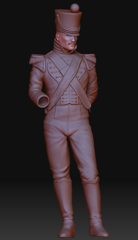 Hola a todos. Estoy desde hace varios días dándome la cabeza contra la pared a ver si de una vez por todas empiezo a dominar el ZBrush. Ahora mismo estoy abocado a este modelo, inspirado en una de esas miniaturas para pintar. Se trata de un oficial de infantería de los highlands. Me encantan esos uniformes de las guerras napoleónicas. De momento llevo hecho esto.
